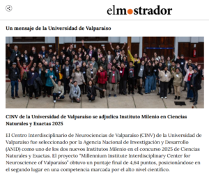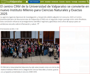 El Centro Interdisciplinario de Neurociencias de Valparaíso (CINV) de la Universidad de Valparaíso fue seleccionado por la Agencia Nacional de Investigación y Desarrollo (ANID) como uno de los dos nuevos Institutos Milenio en el concurso 2025 de Ciencias Naturales y Exactas. El proyecto, titulado “Millennium Institute Interdisciplinary Center for Neuroscience of Valparaíso – CINV”, obtuvo un destacado puntaje final de 4,64 puntos, posicionándose en el segundo lugar entre las siete propuestas que llegaron a la etapa final, en una competencia marcada por el alto nivel científico de los postulantes.