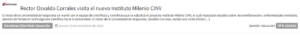 El rector de la Universidad de Valparaíso, Osvaldo Corrales, realizó una visita oficial al nuevo Instituto Milenio CINV, recientemente adjudicado en el Concurso de Institutos Milenio de Ciencias Naturales y Exactas 2025 de ANID. Durante la reunión realizada en la casona del Centro Interdisciplinario de Neurociencia de Valparaíso (CINV), con el grupo de científicas y científicos que se adjudicó el proyecto Instituto Milenio CINV, la máxima autoridad universitaria felicitó al equipo académico e investigador por este logro que consolida el liderazgo científico de la institución en el campo de la neurociencia.